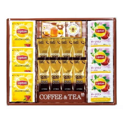 ネスカフェゴールドブレンド(カフェラテ・カフェラテ(コク深め))(各7)×各4、リプトンティーバッグ(イエローラベル・ダージリン)(各2g)×3、純粋はちみつ(15g)×2