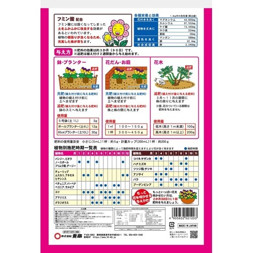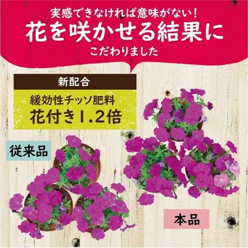リン酸が高いので花付き・実付きが良くなります。速く、じっくり効くので肥料切れ防止に! |
