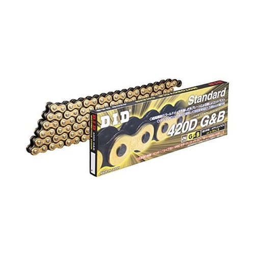 420Dシリーズのゴールド&ブラック仕様バイク用チェーンで、耐久性とデザイン性を兼ね備えたモデル。 |