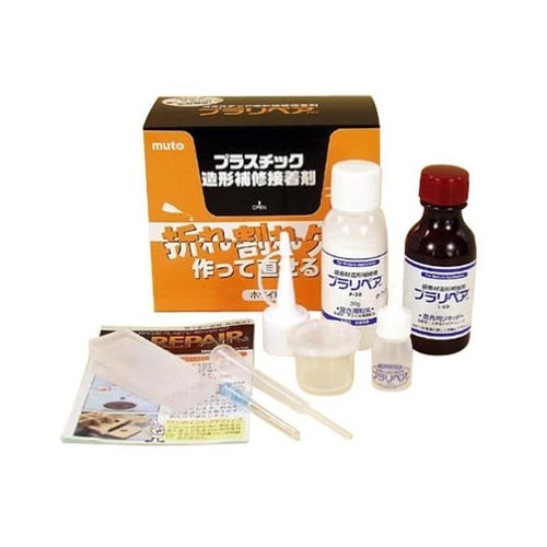 Muto製のプラリペアセット。黒色粉末と液剤がセットになり、中容量補修に最適。 |