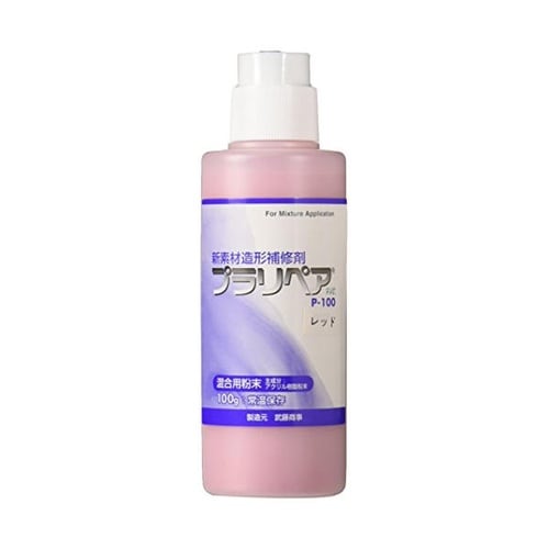 Muto製のプラリペア粉末。赤色タイプでプラスチック補修に使用し、容量100gで強力な接着力を発揮。 |