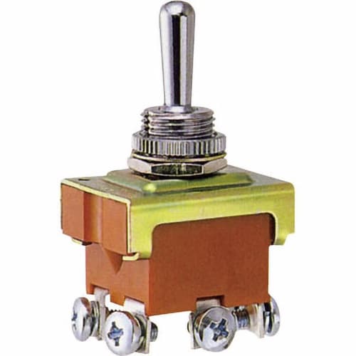 山口電機工業製のトグルスイッチ。ON−OFF−ON自動戻り機構付きで、操作後に自動でOFFに戻る安全設計。 |