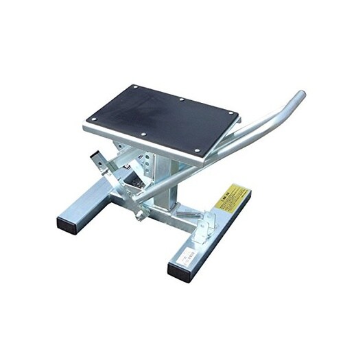 オフロード車やトライアル車に対応したメンテナンススタンド。軽量で持ち運びやすく、整備や保管時に便利な設計。 |