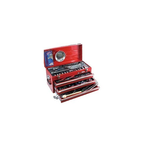 差込角3/8インチと1/4インチ対応の109点入りツールキット。整備やメンテナンスに必要な工具を赤色ケースに収納したセット。 |