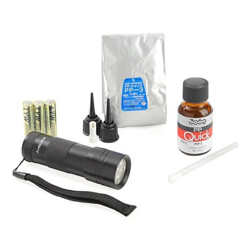 PP樹脂補修用瞬間接着剤とUVライトを組み合わせたフルセット。強力な接着と硬化を実現。 |