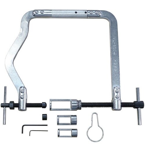 バルブスプリング脱着用の可変ストローク機構を備え、片側マニホールド装着状態でも作業でき、ストローク70mmにより多くの車種へ対応できる高機能工具です。 |