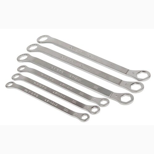 6角と12角を同サイズで備えた薄型レンチで、12ー14mmは4.5mm厚、21ー24mmは5mm厚とサイズ別に最適化され、角度15°で狭い箇所でも扱いやすい仕様です。 |