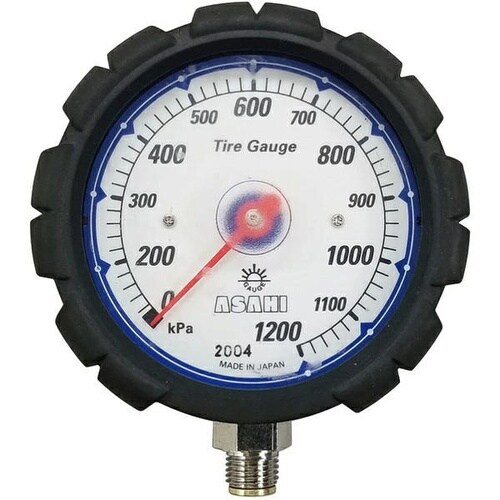 旭産業AGE1200R対応の1200kPa仕様メーターアセンブリ。ゲージボタル交換用黒針モデルで高圧タイヤ空気圧管理に適合。 |