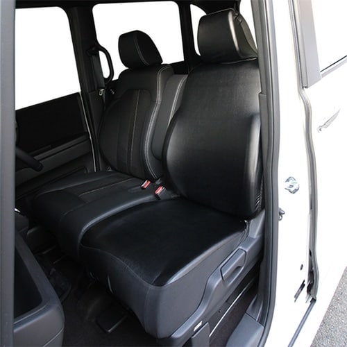 縦横に伸びるストレッチレザーのシートカバーです。取付が簡単でフィット感が高く、汚れ防止に最適です。サイドエアバッグ対応です。 |