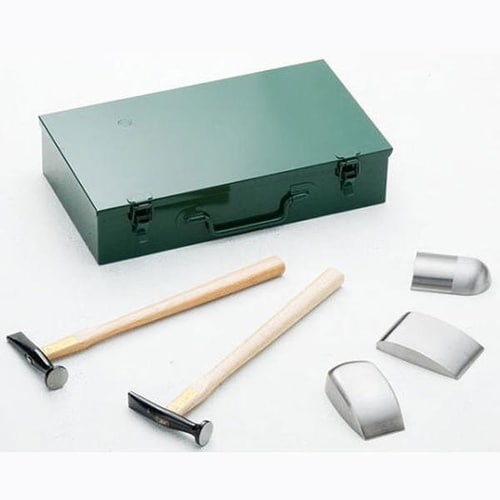 自動車ボディパネルの叩き出しや成形作業に使用する基本構成の板金用フェンダーセットで、アテバン3種とハンマー2種を専用メタルケースにまとめたプロ向けモデル。 |