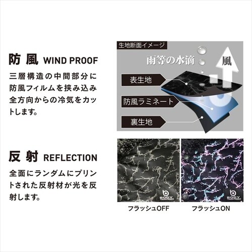 風を断つ!反射する!防風:三層構造の中間部分に防風フィルムを挟み込み、全方向からの冷気をカットします。反射:全面にランダムにプリントされた反射材が光を反射します。サイズ:FREE。 |