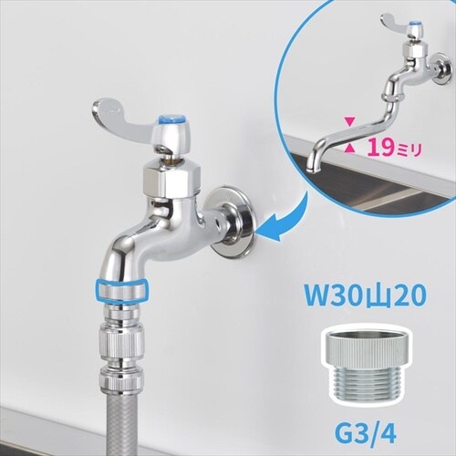 自在水栓、混合栓の大口径吐水パイプネジW30山20をG3/4に変換するアダプターです。 |