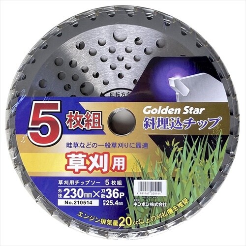 畔草等の一般的な雑草刈りに最適!衝撃に強い斜埋込チップ採用で普段使いに!エンジン排気量25cc以上の刈払機を推奨。外径230mm×刃数36P。内径25.4mm。5枚組。 |