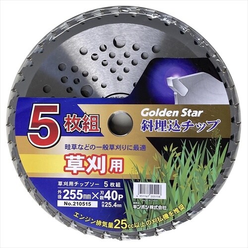 畔草等の一般的な雑草刈りに最適!衝撃に強い斜埋込チップ採用で普段使いに!エンジン排気量25cc以上の刈払機を推奨。外径255mm×刃数40P。内径25.4mm。5枚組。 |
