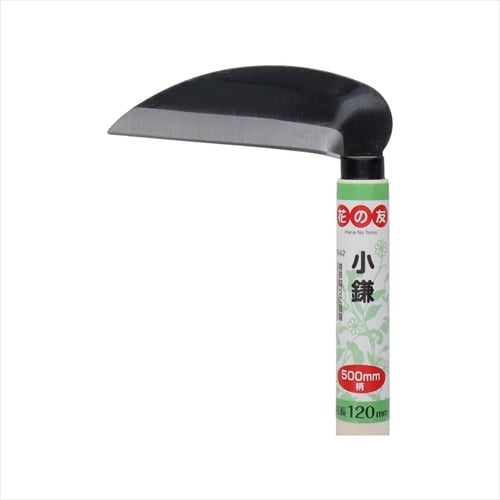 雑草刈りに最適。狭い場所に便利。雑草刈りに最適です。狭い場所に便利な小鎌です。全長:540mm。刃渡り:120mm。柄の長さ:500mm。 |