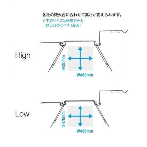 焚き火台に合わせて高さが変えられるアイアンスタンド。オプションの追加で調理に最適なシステムスタンドになります。各社の焚火台に合わせて高さが変えられます。 |