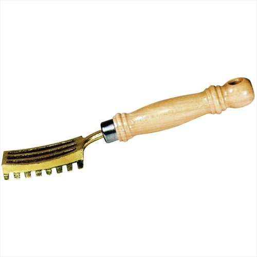 持ち手が木で使いやすいウロコ取り。金具部の外刃にテーパーが付いています。 |