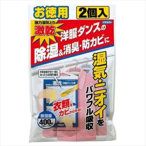 「激乾洋服ダンス用徳用 2個入」は、除湿・消臭・防カビと3つの効果がある、コンパクトな洋服ダンス用除湿剤です。 |