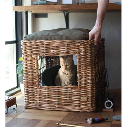皮付きラタンを使って編まれた猫用トイレカバー。 |