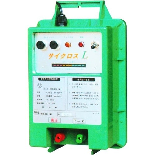 LEDメーター採用の中距離(室内用)型電気柵出力モニター付アース不良ランプ付出力低下防止回路(パワーアップ機能)。 |