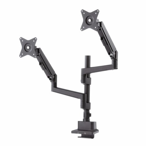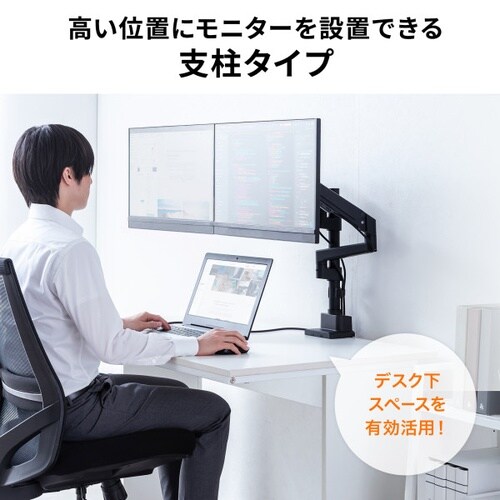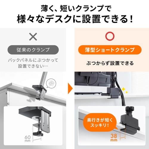 わずか奥行き38mmの薄型ショートクランプタイプのデュアルモニターアーム。支柱タイプで幅広い高さ調節が可能。ガススプリング式。 |