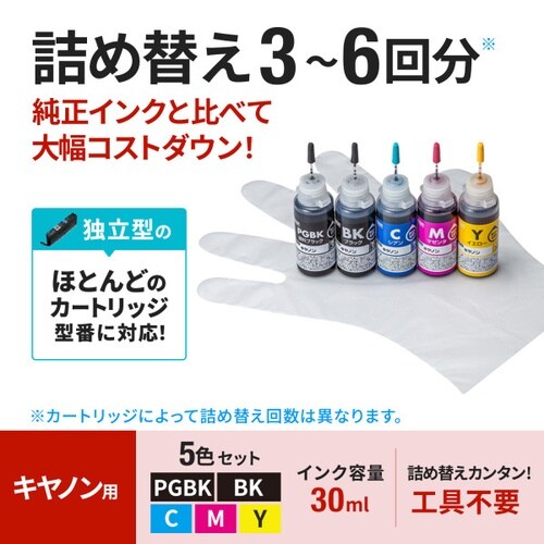 インクカラー:顔料ブラック、ブラック、シアン、マゼンタ、イエロー | 内容量:各30ml | セット内容:手袋×1組 | 詰め替え方法:点下方式 | …