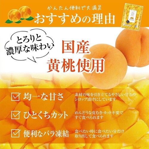 食べやすい一口サイズにカットし冷凍した国産の黄桃です。黄桃の味わいを引き立てる優しい甘さのシロップ漬けにし、とろけるような食感に仕上げました。 |