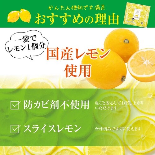 旬の時期に収穫したレモンを洗浄後、丁寧にスライスしました。料理やデザート、飲み物に添えるだけでさわやかな香りと酸味を手軽にお楽しみいただけます。 |