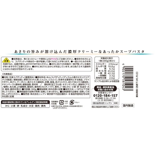 あさりと3種の野菜(ほうれん草じゃがいもにんじん)が入った食べ応えのあるスープパスタ。 |