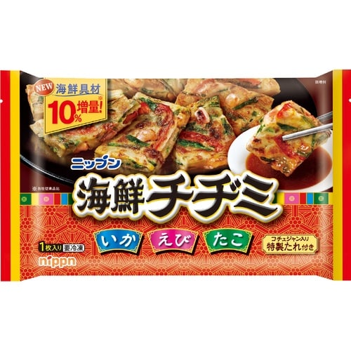 3種の海鮮具材が入った具だくさん海鮮チヂミ。特製たれ付き。 |
