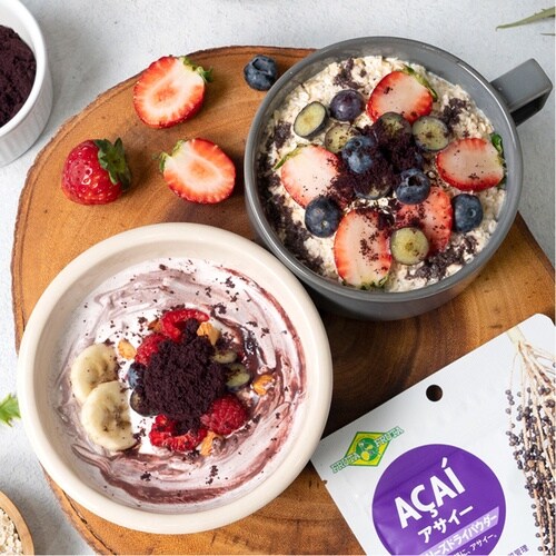 本商品はいつでもどこでも手軽にアサイーを摂取できるようパウダー化したものです。香味色栄養価の劣化を抑えるため「フリーズドライ製法」を採用。さらに鮮度を保つ工夫をしPOV30以下を規格化しました。 |