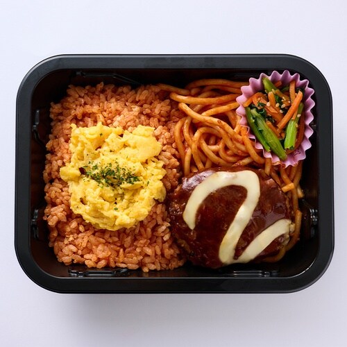 高温短時間で炒め上げたチキンライスにたまごを盛り付け、チーズハンバーグ、ケチャップスパゲティを組み合わせトリプルメインのお弁当です。 |