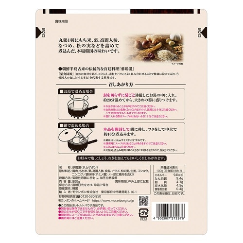 丸鶏1羽にもち米栗高麗人参なつめ松の実などを詰めて煮込んだ本場韓国の味わいです。お好みでねぎやこしょうなどを加えてもおいしく召しあがれます。 |