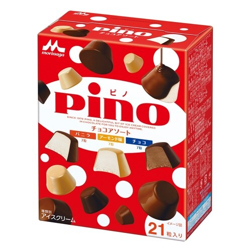 バニラ(7粒)×アーモンド味(7粒)×チョコ(7粒)の3種類の味を詰め合わせたひとくちアイス「ピノ」のアソートパック。 |