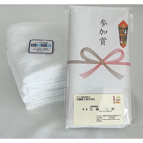 抗菌加工をした白のタオルです。イベントやスポーツ大会などでお使い頂ける「参加賞熨斗付きタオル」です。袋には名刺を入れられるポケットがついております。 |
