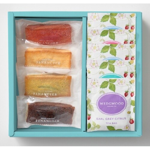 ストロベリー、プレーン、ピスタチオ、チョコの4種類のフィナンシェと、ウェッジウッドの代表柄「ワイルド ストロベリー」の可愛らしいパッケージの4種類のティーバッグをセットしました。 |
