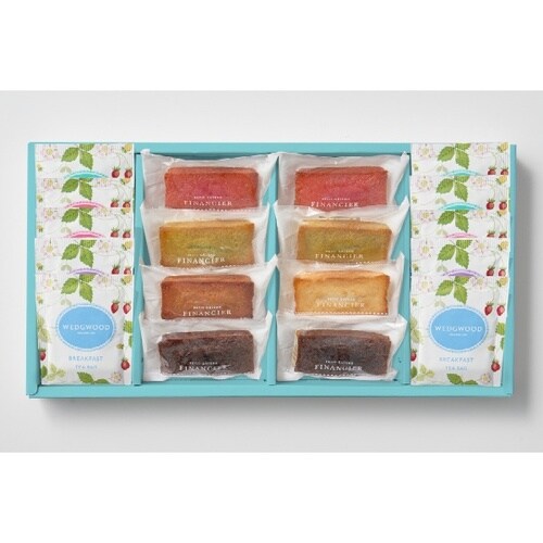 フィナンシェ(ストロベリー・ピスタチオ・チョコ×各2個、プレーン・イチジク×各1個)、ワイルド ストロベリーティーバッグ(ブレックファストティーバッグ・アフタヌーンティーバッグ×各3袋、ストロベリーティーバッグ・アールグレイシトラスティーバッグ×各2袋) ※フィナンシェはウェッジウッドの商品ではありません。