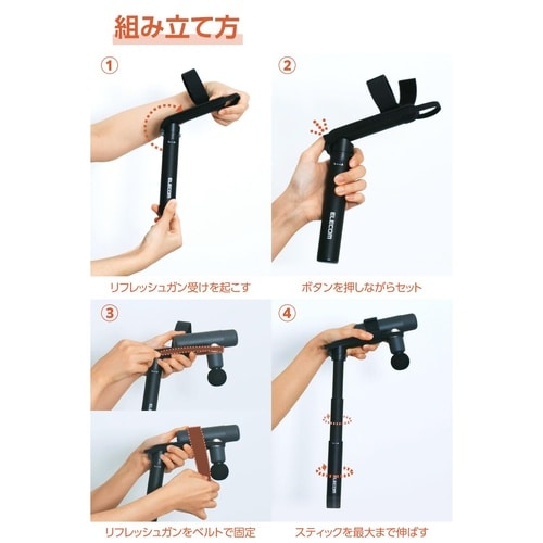 お手持ちのリフレッシュガン・マッサージガンを取り付けるだけで、手が届きにくい肩甲骨や背中などのセルフケアができます。マッサージガンの重さや振動で持つのが辛い方にもおすすめです。 |