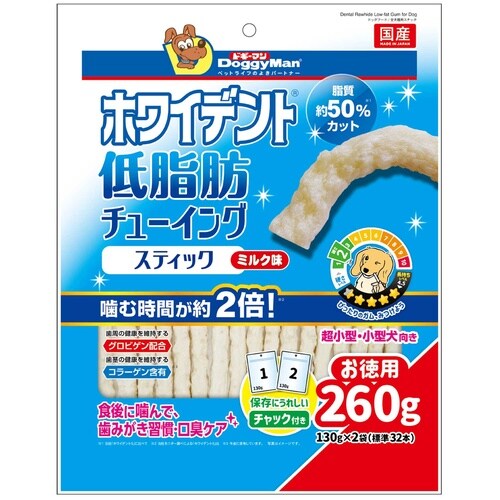 適度な粘りでしっかり長く噛める、スティック形状のガム。脂質を調整した低脂肪タイプ。ミルク味。 |