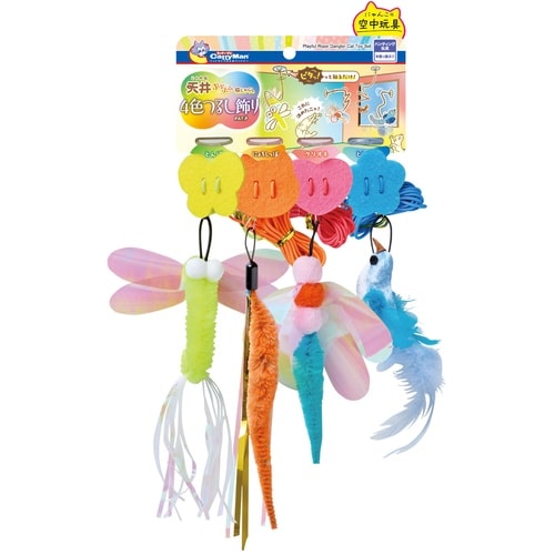 天井や窓などに取り付けて遊べるセルフ猫じゃらしの4種セット。引っ張るほどに楽しいゴム紐タイプ! |
