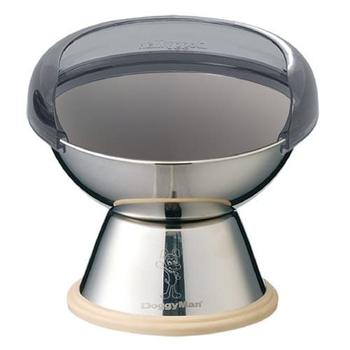 元気よく食べるワンちゃんのお水やフードの飛び散りをガードするカバーがついたステンレス製背高食器M |