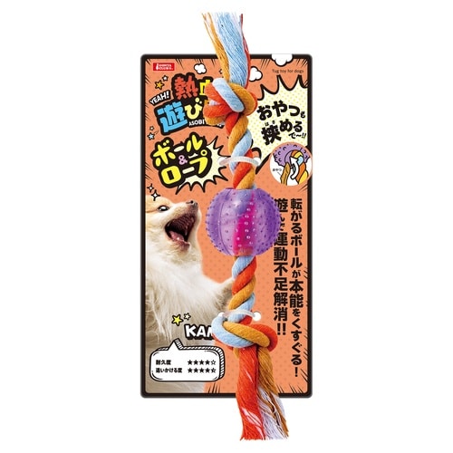 TPR玩具とロープの間におやつを挟むことでさらに楽しめる! |