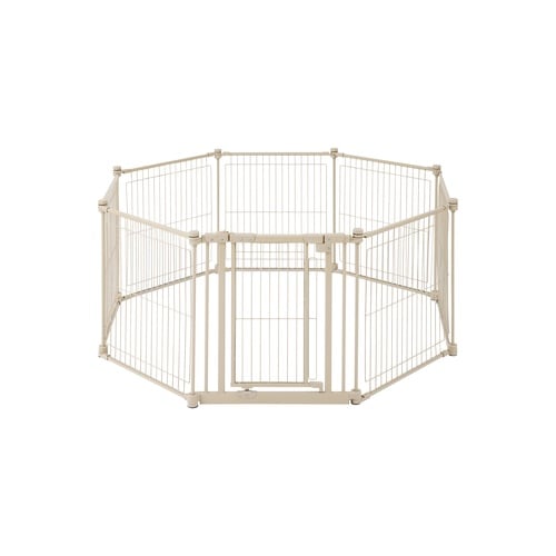 自由に形状を選べるので、お部屋に合わせてレイアウトできるスチールサークルです。パネルの線材のすき間が約36mmで、子犬でも挟まりにくい安心設計です。 |