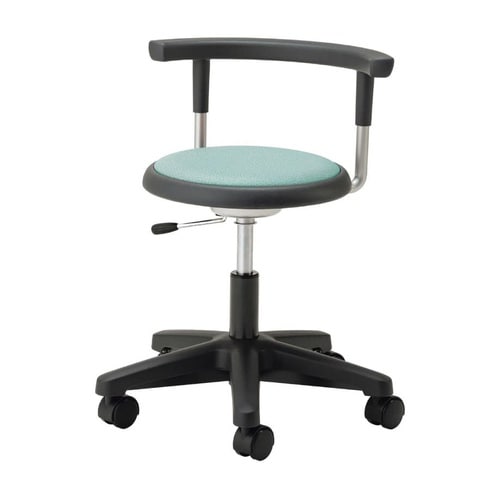 座面枠にはソフトな感触の樹脂ブロー成型クッションパッド付。準耐アルコール耐次亜塩素酸、抗菌防汚難燃加工のビニールレザーを採用。 |
