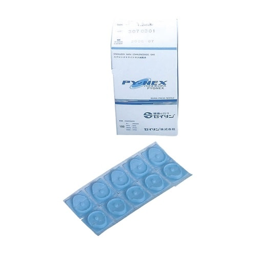 カラー:ブルー・製品サイズ:鍼長1.2×線径0.20mm・本体重量:1本での重量計測無・材質:テープ=マイクロポアテープ、円皮鍼=ステンレス・個装入数:100本