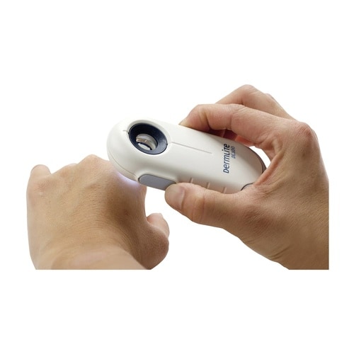 明るい白色LEDと10倍レンズ、交差偏光技術によってノンオイルで皮膚に触れずに観察できます。 |