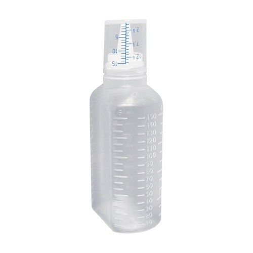 計量カップと合体した便利な投薬瓶。本体は凹凸目盛りです。ノズル式なので薬が少しずつ出せます。 |