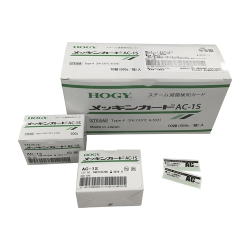 あいはISO11140−1タイプ4のメッキンカード(A.C用検知カード)。滅菌条件に対して色調変化の精度が高く、読み取りやすいのが特徴。うはEOガス滅菌用。 |