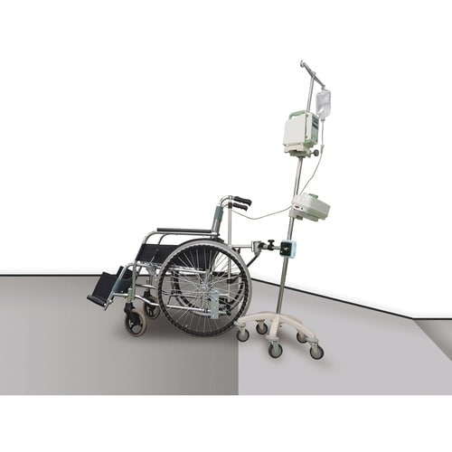 病院でお使いの車椅子と点滴台を連結し、車椅子搬送の安全性を向上します。製品の車椅子への付け外しには工具が必要です。 |