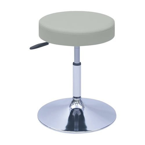 患者様にも安心感を与える安定性の高い直径39cmの円盤脚チェアー。床面にキズを付けない滑り止め効果のあるポリエチレンリング付き。
